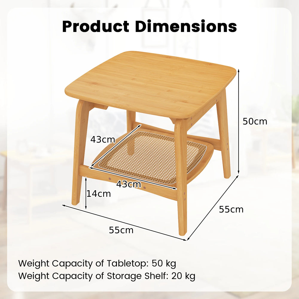 Boho Bamboo Sofa Side Table with Faux Rattan Storage Shelf-Natural