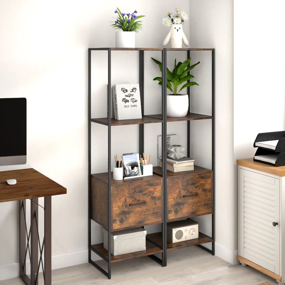 5-Tier Tall Narrow Bookcase Bookshelf with Drawer Shelves-Rustic Brown
