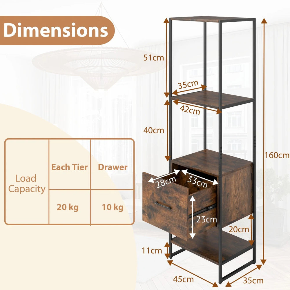 Colour: Rustic Brown /White Material: Metal, Engineered Wood Overall Dimensions: 45 x 35 x 160 cm (L x W x H) Size of Shelf: 42 x 35 cm (L x W) Spacing Between Adjacent Shelves: 51 cm, 40 cm, 20 cm Inner Size of Drawer: 33 x 28 x 23 cm (L x W x H) Height off the Ground: 11 cm Load Capacity of Each Tier: 20 kg Load Capacity of Drawer: 10 kg Net Weight: 18 kg Package Includes: 1 x Bookshelf 1 x Instruction Manual