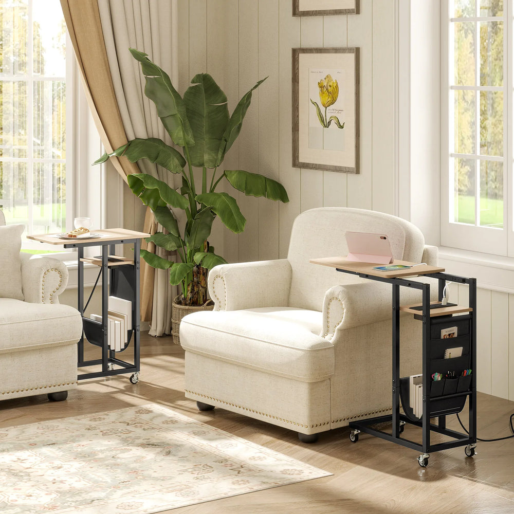 C-shaped End Table Rolling with Charging Station and Retractable Tabletop-Natural