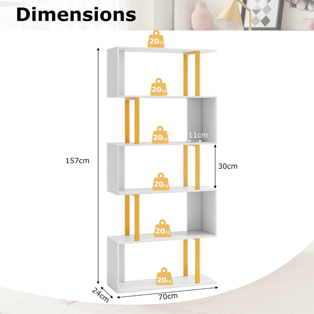 Colour: White + Gold Material: Metal, MDF 5-Tier Overall Dimensions: 70 x 24 x 157 cm (L x W x H) Height Between Shelves: 30 cm Width of Backboard: 11 cm Weight Capacity of Each Tier: 20 kg Net Weight: 16 kg 6-Tier Overall Dimensions: 70 x 24 x 189 cm (L x W x H) Space Between 2 Tiers: 30 cm Width of Backboard: 11 cm Weight Capacity of Each Tier: 20 kg Net Weight: 19 kg Package Includes: 1 x Bookshelf 1 x Instruction Manual