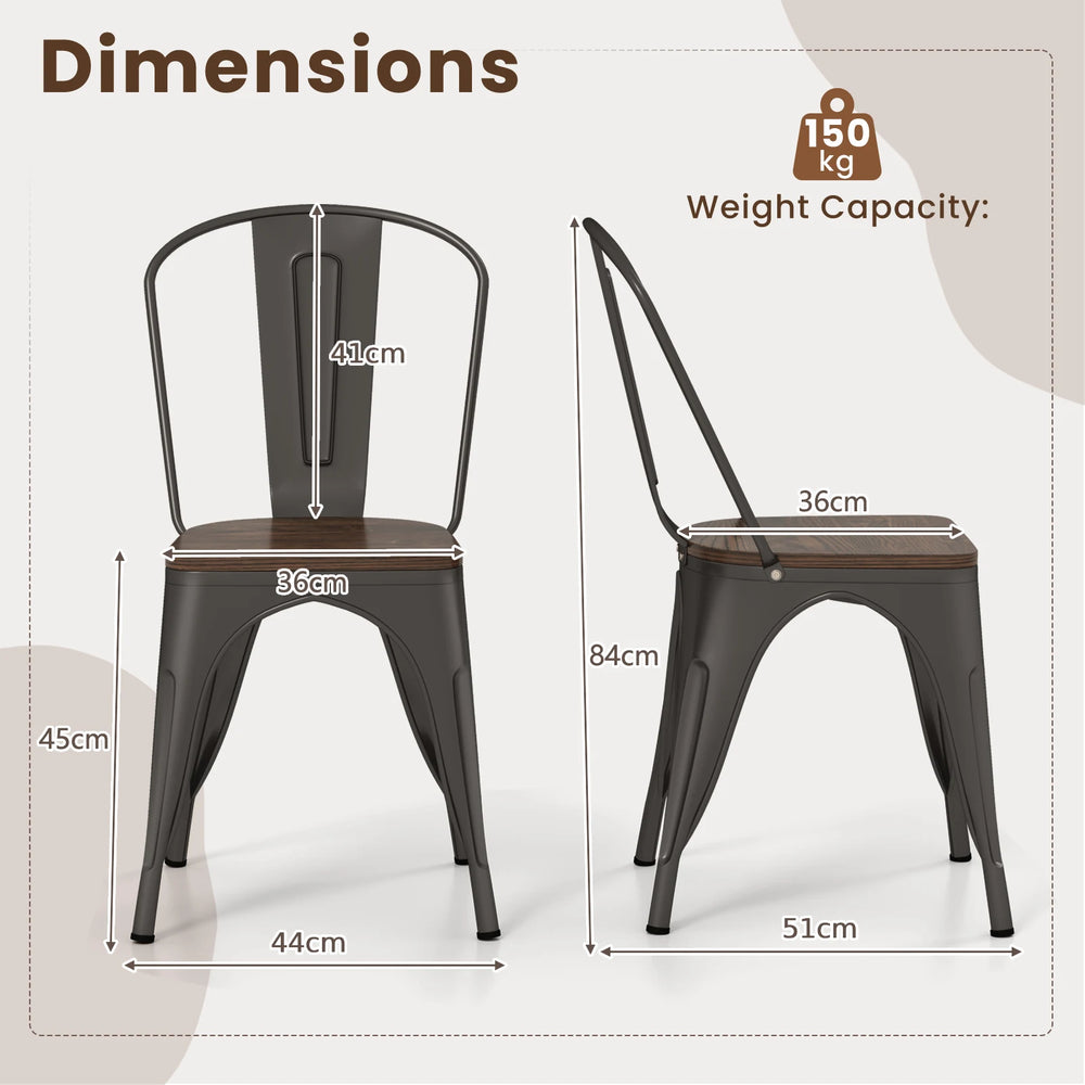 Color: Gun Material: Metal, Elm Wood Overall Dimensions: 44 x 51 x 84 cm (L x W x H) Seat Height: 45 cm Seat Size : 36 x 36 cm (L x W) Weight Capacity: 150 kg Net Weight of Each Chair: 5 kg Box QTY: 1(May vary by batch) Package Includes: 4 x Metal Dining Chairs 1 x User Guide