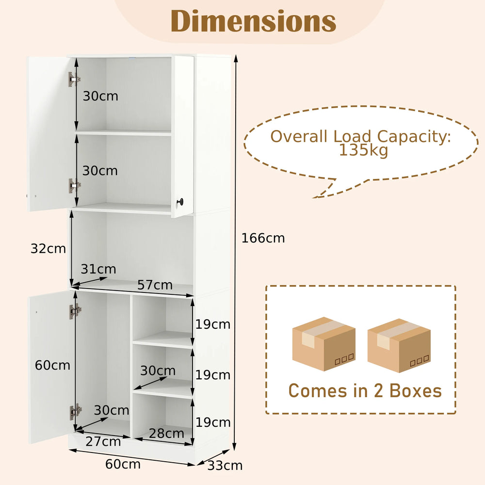 Specification:Colour: WhiteMaterial: Engineered Wood, MDFOverall Dimensions: 60 x 33 x 166 cm (L x W x H)Dimensions of Microwave Countertop: 57 x 31.5 x 32.5 cm (L x W x H)Shelf Height in 2-Door Cabinet: 30.5 cmInside Dimensions of Single Door Cabinet: 27.5 x 30 x 60.5 cm (W x D x H)Dimensions of Open Shelf: 28.5 x 30 x 19.5 cm (W x D x H)Maximum Weight Capacity: 135 kgNet Weight: 30 kg Package Includes:1 x Kitchen Hutch Cabinet1 x User Manual