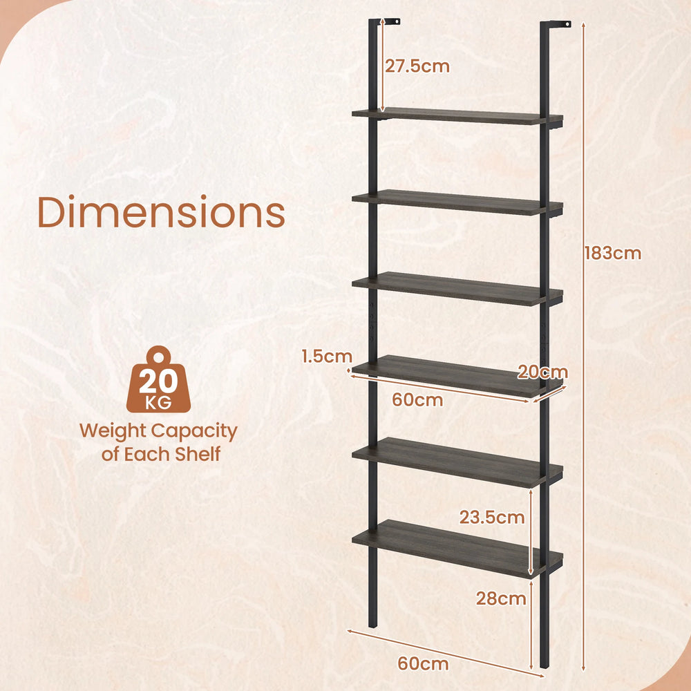 6-Tier Ladder Shelf Wall Mounted Bookshelf with Metal Frame-Oak