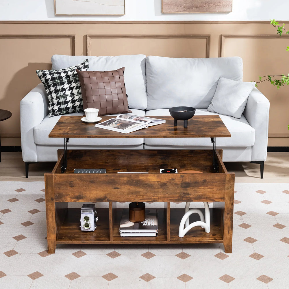 Rising Center Table with Lift Top Hidden Compartment-Rustic Brown