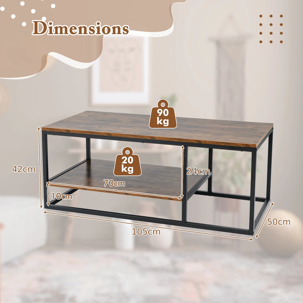 Colour: Rustic Brown Materials: Engineered Board, Metal Overall Dimensions: 105 x 50 x 42 cm (L x W x H) Weight Capacity of Tabletop: 90 kg Weight Capacity of Shelf: 20 kg Net Weight: 13.5 kg Package Includes: 1 x Coffee Table 1 x Instruction Manual