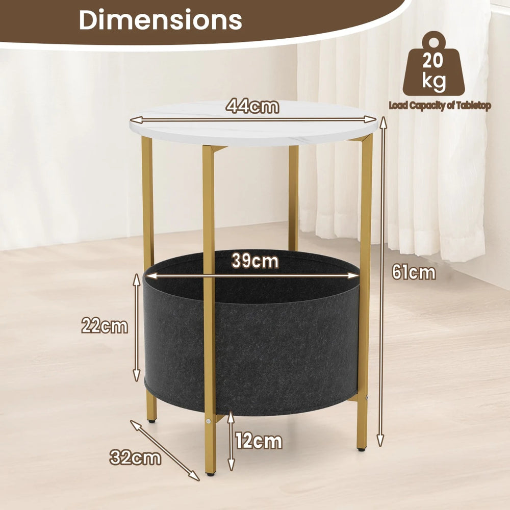 Material: Metal, Engineered Wood, Felt Overall Dimensions: 44 x 61 cm (Dia x H) Size of Felt Basket: 39 x 22 cm (Dia x H) Height off the Ground: 12 cm Load Capacity of Tabletop: 20 kg Load Capacity of Felt Basket: 10 kg Net Weight: 3.5 kg . Package Includes: 1 x Side Tables 1 x Instruction Manual