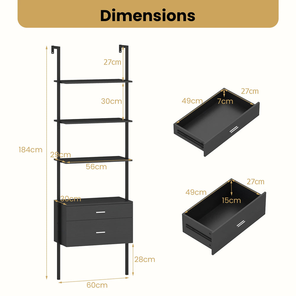 6-Tier Ladder Bookcase with 2 Drawers and Metal Frame-Black