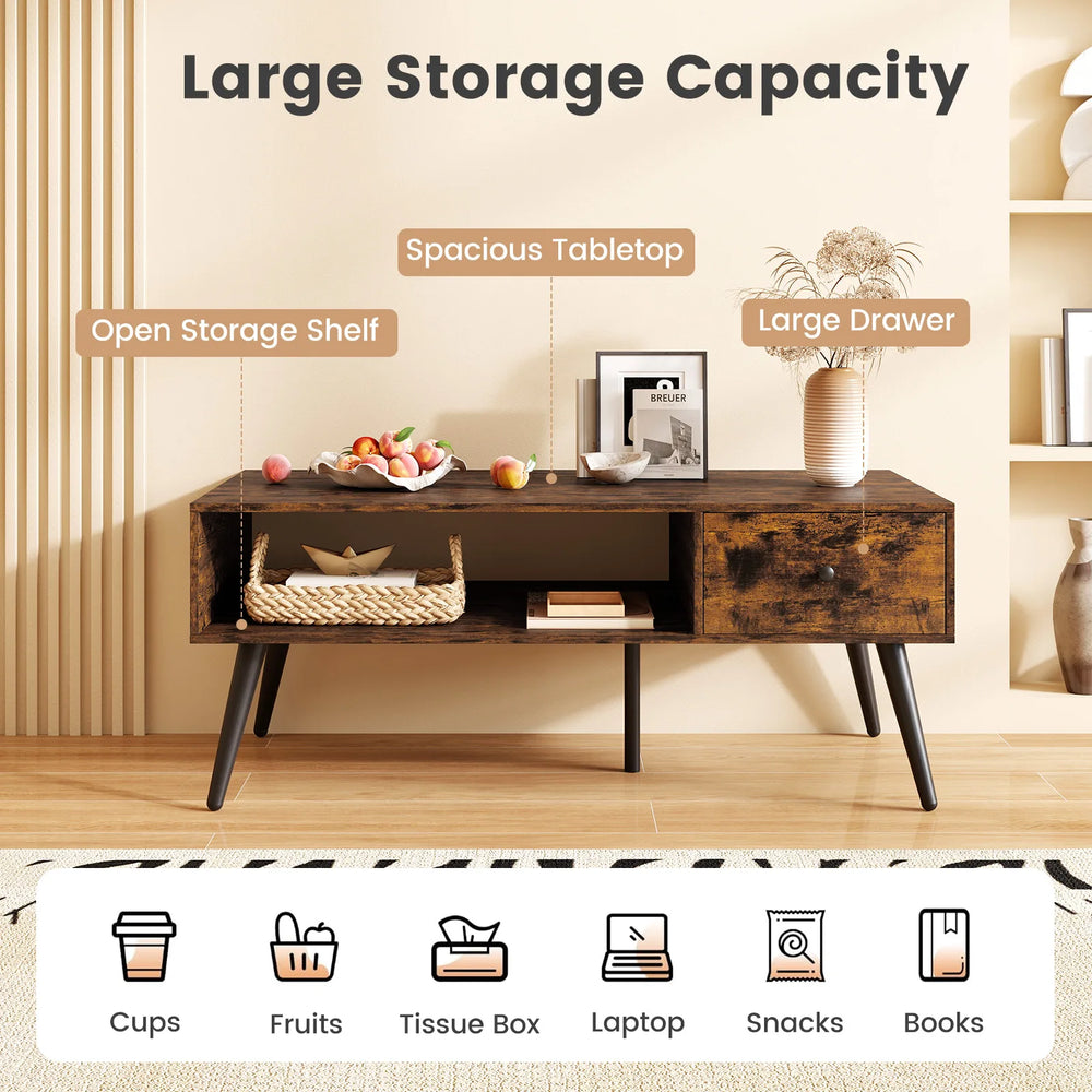 109cm Rectangular Coffee Table with Drawer and Storage Shelf-Rustic Brown