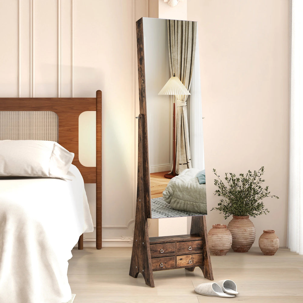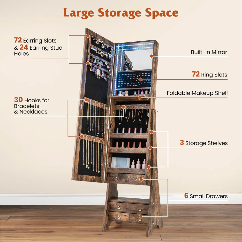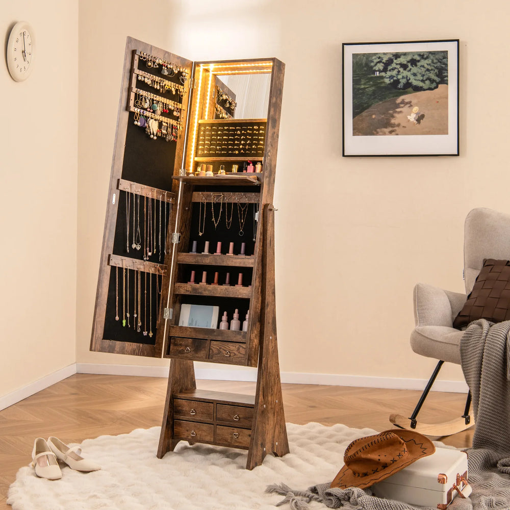 3-Color LED Lighted Jewelry Cabinet with Full-Length Mirror and Adjustable Tilt Angles-Rustic Brown