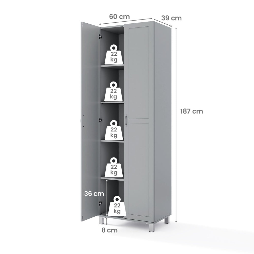 Colour: White Material: Engineered Wood, MDF, Plastic Overall Dimension: 60cm x 39cm x 187cm(L x W x H) Net Weight: 42kg Weight Capacity of Each Shelf: 22kg Box qty: 1 Package Includes: 1 x Pantry Cabinet 1 x User Guide