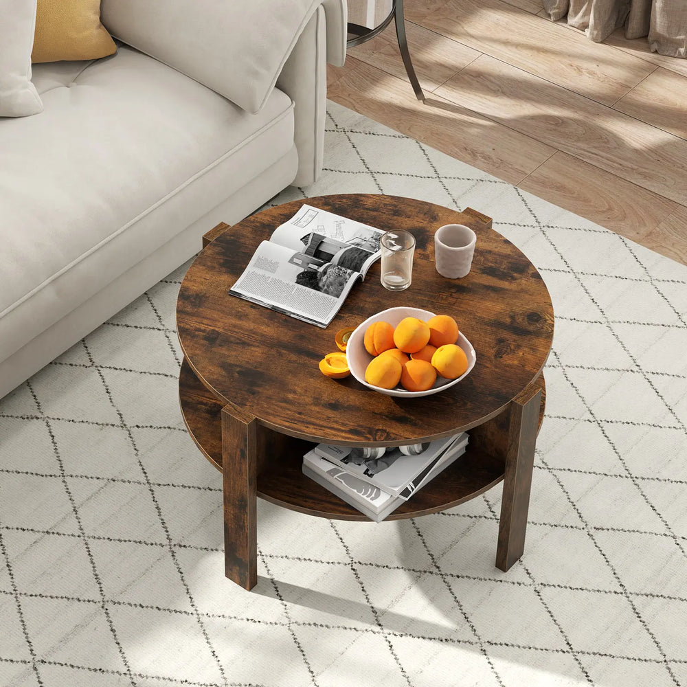 2-Tier Round Coffee Table with 4 Shelves-Rustic Brown