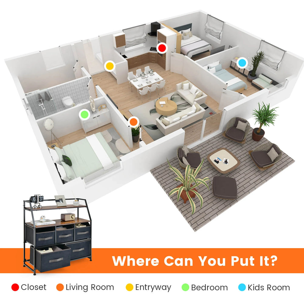 This compact 5-drawer storage dresser pairs a sturdy MDF frame and metal supports with lightweight, removable non-woven fabric drawers for easy organisation. Two tiers of top storage let you keep everyday items within reach while the foldable fabric bins tuck away when not in use. The uncomplicated silhouette and Black + Brown finish suit both bedroom and living-room settings.