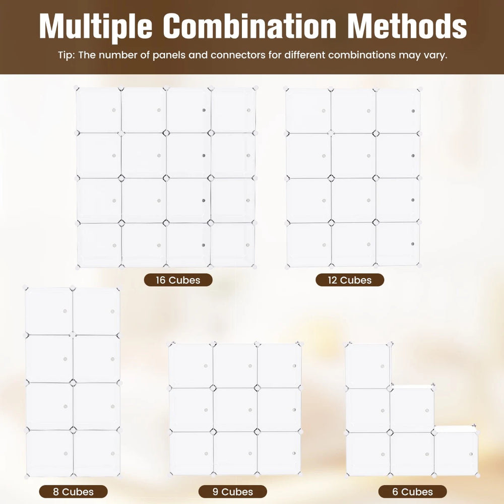 There are 10 cubes for placement and 2 rectangular compartments with poles for hanging. All your T-shirts, dresses, suits, coats and jackets can be well organized in our modular storage shelf. The waterproof and dust-proof doors give your items good protection. Made of premium PP material and steel, the bookshelf is ultra-sturdy and durable. Besides, it's easy to assemble. You can use our hammer provided to check if sheets are locked in the deepest positions. Moreover, the multi-direction connectors make it convenient for you to transform the shape to your preference. If you are looking for a cube storage organizer like this, do not hesitate to place an order! Large Capacity Wardrobe Closet: This large capacity wardrobe closet features 10 individual storage cubes and 2 hanging rails. The portable wardrobe is suitable for storing clothes, shoes, bags, hats, socks, pillows and more. Besides, different from other storage cubes, our storage cube measures 35 x 35 x 45cm(L x W x H), which offers deeper and larger storage space. Multiple Combination Methods: Thanks to its modular design, you can freely enjoy fun of DIY when assembling our cube storage organizer. Tip: The number of panels and connectors for different combinations may vary. You can choose to connect 14 cubes, 12 cubes, 9 cubes, 8 cubes or 6 cubes for different storage usages. (Please note: although we have 16 cubes, we actually have 2 hanging rails, which can be combined with 14 cubes at most). Stable and Sturdy Structure: Solid steel frame and sturdy PP connectors ensure overall stability and long-lasting service life. Thus, the DIY interlocking combination armoire is not easy to wobble or collapse after setting up. Additionally, each cube supports up to 5kg (for 1-7 pieces of clothes), and each hanger holds up to 5kg (for 1-5 pieces of clothes). Versatile and Space-saving Design: With classical colours, exquisite pattern and extra opening holes, our cube closet combines aesthetic and practicality. And the modular cabinet won't take up too much floor space. You can use it in your bedroom, living room, dressing room, entryway, etc. Simple Assembly and Easy Cleaning: The package comes with 52 PP connectors, 36 larger black panels, 16 smaller black panels, 16 white panels, 2 hangers, 1 hammer and 1 user manual. Thus, you can conveniently and easily assemble it. What's more, the waterproof surface makes it easy to clean with a damp cloth.