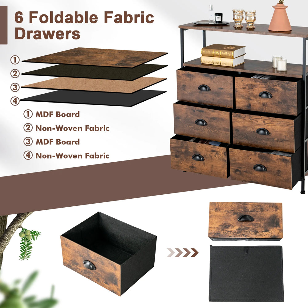 With 6 fabric drawers and a 2-tier display shelf, this dresser features both open and enclosed storage space, meeting your various storage needs. The fabric drawers are foldable and equipped with metal handles for smooth opening and closing. The surface of the 2-tier display shelf is waterproof and easy to clean with a wet cloth. Constructed with an anti-rust steel frame, this 6-drawer dresser features a sturdy and durable structure. The height-adjustable feet can protect your floor from scratching when moving the dresser. The chest organizer is easy to put together with instructions and accessories. The foldable drawers largely facilitate the installation process. Designed in stylish and rustic style, our fabric storage drawer unit is perfect for many places, such as the living room, bedroom, entryway and more. Bullet Point: Ample Storage Space: This dresser is equipped with 6 fabric drawers and each drawer can hold up to 5 kg, which is enough for all your daily supplies such as clothes, books, toys and more. Featuring double display shelves, the dresser allows you to store frequently-used supplies in a convenient place, keeping your space clean and tidy. Sturdy Frame & Premium Material: The powder-coating steel frame provides high stability and outstanding rust resistance for long service life. Besides, this 6-drawer dresser employs P2 grade MDF that is more eco-friendly and durable. The drawer combines MDF and non-woven fabric and is not easy to deform after a long time of use. Upgraded Stability & Safety: The additional X-shaped bars on the back of the storage drawer unit surely enhance the overall stability. And the 4 height-adjustable feet not only keep the balance on uneven surfaces but also protect the floor from scratching. In addition, the anti-toppling device can fix the unit to the wall and prevents accidents. Rustic Style Fits Anywhere: With a simple and modern appearance, this storage cabinet will be a practical and eye-catching storage organizer in your space, fitting in easily with diverse decoration styles. You can use the storage cabinet for a bedroom nightstand, living room, closet, entryway, hallway and more. Foldable Drawers & Easy Assembly: The assembly is easy and quick with included instructions and accessories. After assembling the whole frame, you only need to unfold the drawers and push them into designated places. Overall dimension: 80 cm x 30 cm x 89.5 cm (L x W x H). Features: Large storage capacity with 2-tier shelf and 6 drawers High stability and superb durability with an anti-rust steel frame Adopts premium MDF material with a waterproof surface Adjustable feet can protect the floor from scratching The anti-toppling device allows you to fix the dresser to the wall X-shaped bars add reinforced the structure Simple appearance matches various decorations styles Suitable for plenty of places such as living room, entryway, hallway and more Easy assembly with foldable drawers and instructions Specifications: Colour: Rustic Brown Material: MDF, Non-woven Fabric Overall Dimension: 80 x 30 x 89.5 cm (L x W x H) Drawer Dimension: 36.5 x 28 x 18.5 cm (L x W x H) Weight Capacity of Tabletop: 30 kg Weight Capacity of Shelf: 20 kg Weight Capacity of Each Drawer: 5 kg Net Weight: 12.5 kg Package Includes: 1 x 6-Drawer Dresser 1 x User Guide
