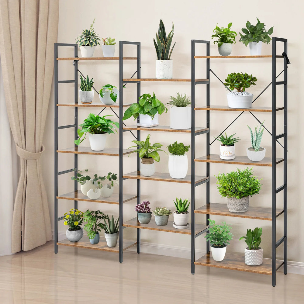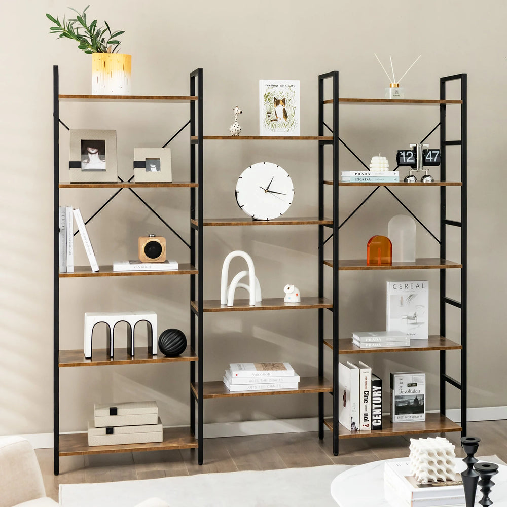 Large Triple Wide Floor Standing Bookcase Display Shelf with Metal Frame-Rustic Brown