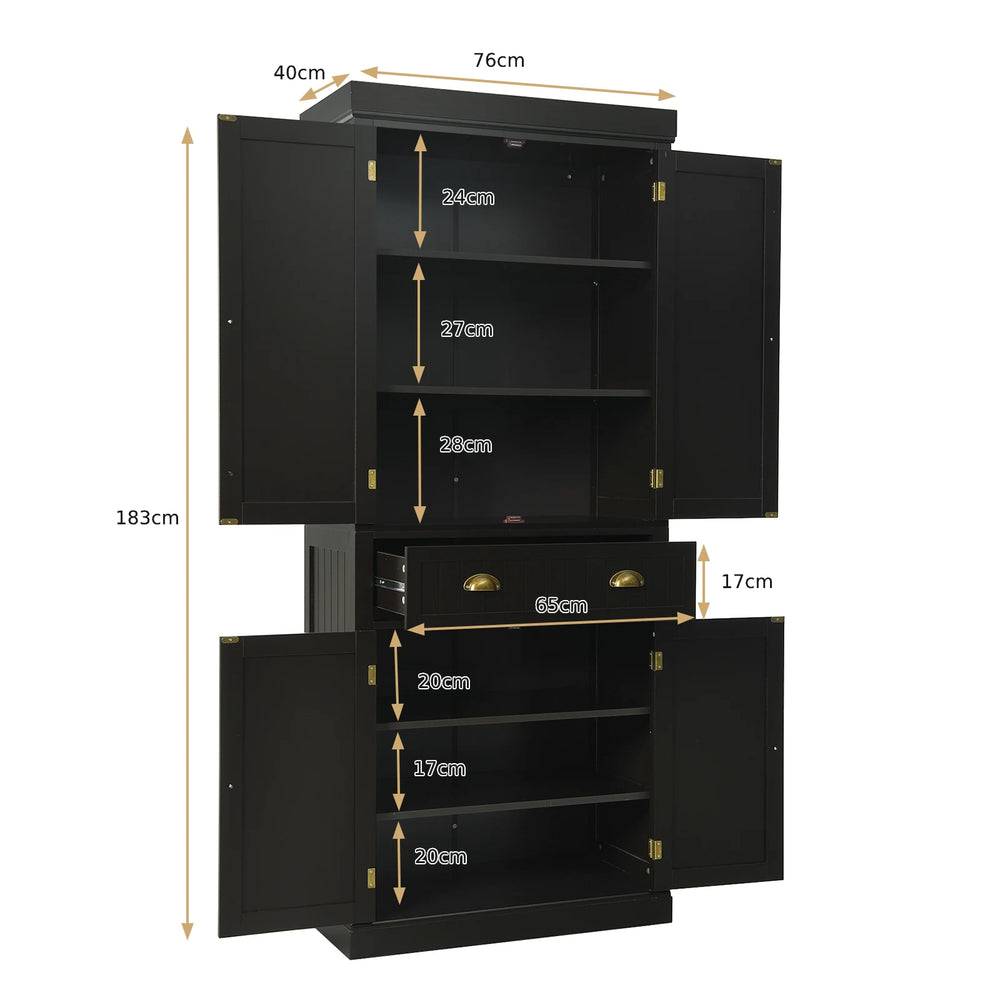 Color: Black/Grey/White Material: P2 MDF, particle board Overall dimension: 76 x 40 x 183 cm (L x W x H) Weight capacity of each shelf: 20 kg Weight capacity of drawer: 10 kg Net weight: 43 kg Package includes: 1 x Storage cabinet 1 x Instruction