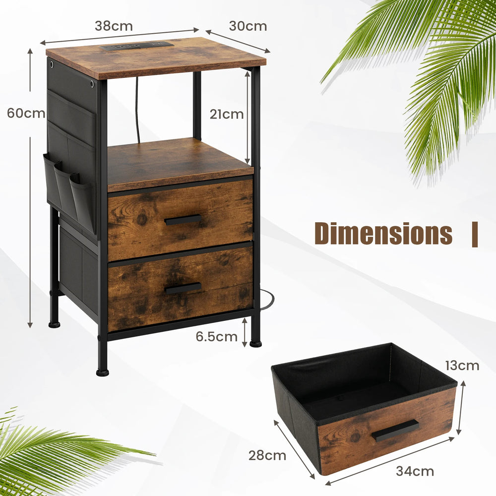 Colour: Rustic Brown + Black Material: Engineered Wood, Metal, Non-woven Fabric Overall Dimensions: 38 x 30 x 60 cm (L x W x H) Drawer Dimensions: 34 x 28 x 13 cm (L x W x H) Weight Capacity of Tabletop: 20 kg Weight Capacity of Open Shelf: 20 kg Weight Capacity of Each Drawer: 5 kg AC Outlet: 250V/13A USB Port: 5V Max 2.1A Power Cord Length: 2 m Net Weight of 2-Pack: 10 kg Package Includes: 2 x Nightstand 1 x Instruction Manual