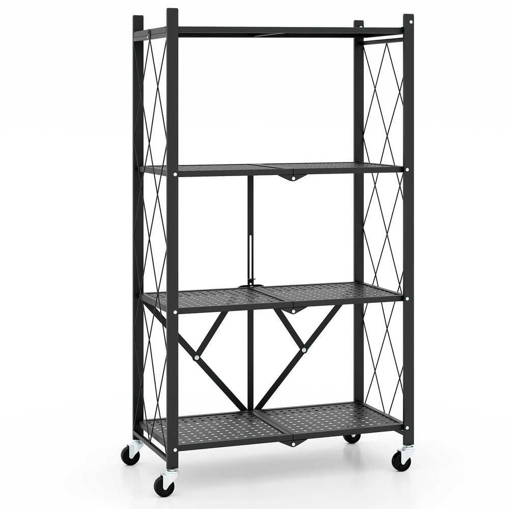 4-Tier Metal Foldable Collapsible Storage Rack with Lockable Wheels-Black