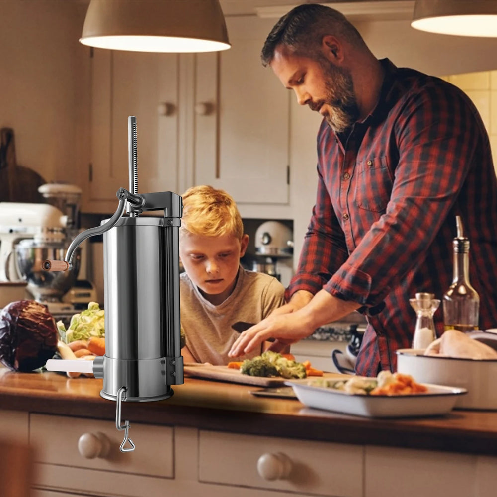 Material: Stainless steel and aluminum Capacity: About 10 lbs Package includes: 1 x Sausage stuffer