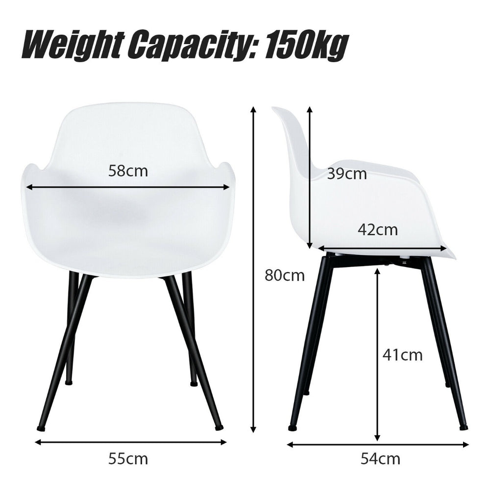 Colour: White Material: PP + steel Dimension of each chair: 58 cm x 54 cm x 80 cm (L x W x H) Seat height: 41 cm Net weight: 10 kg Weight capacity: 150 kg