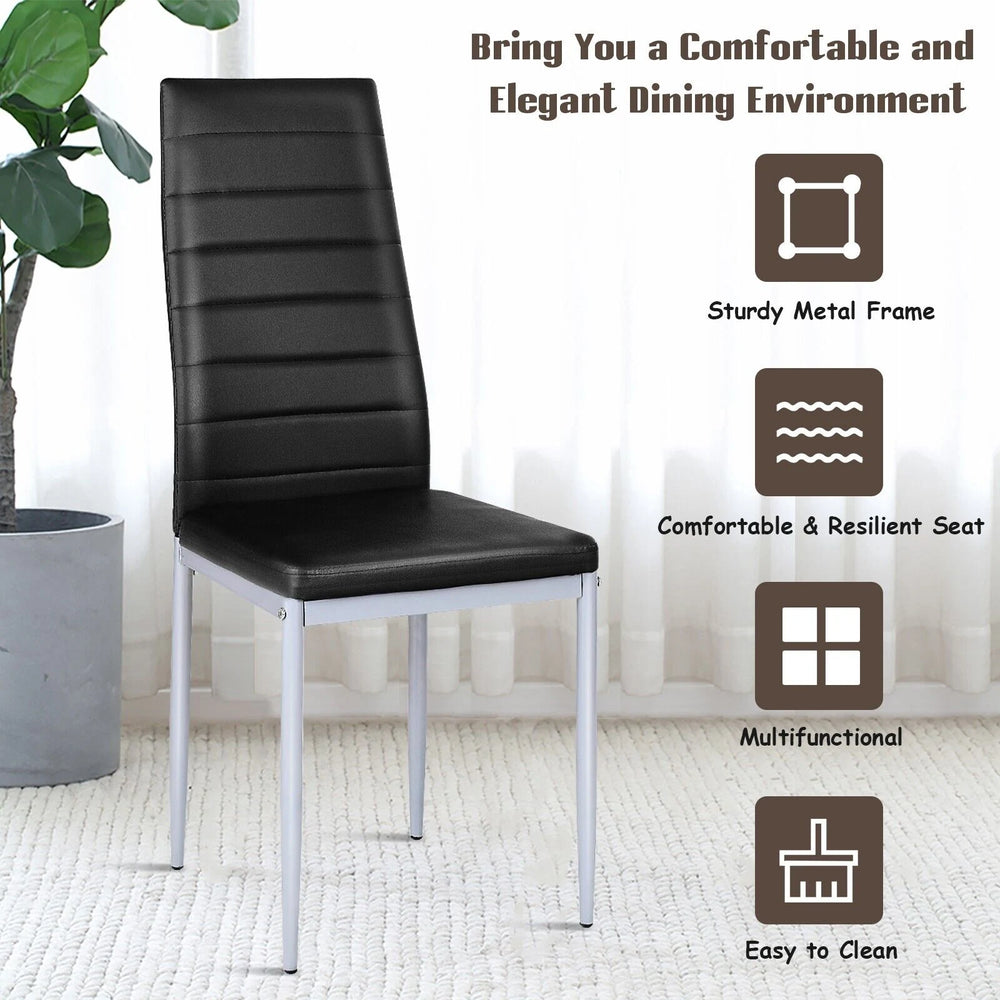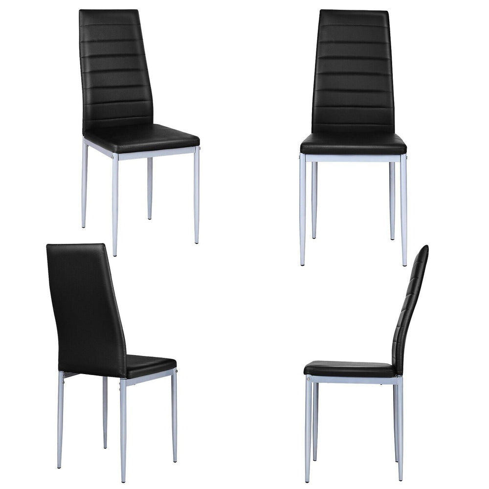 This set of four dining chairs combines practical materials and a clean, modern silhouette to suit homes, restaurants or conference rooms. Each chair is upholstered in PVC leather with soft foam padding for a comfortable seat and an ergonomic high curved back that supports the spine during long periods of sitting.