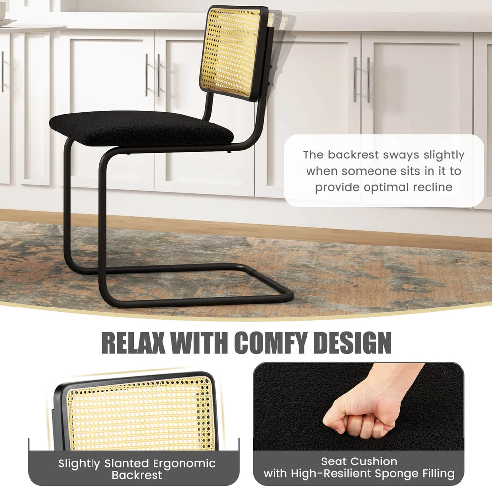 This set of two mid-century modern cantilever dining chairs blends vintage style with contemporary comfort. The sleek U-shaped metal frame gives a subtle floating effect while the hand-woven rattan back adds natural texture and a distinctive geometric look that lifts a dining area, kitchen or study.