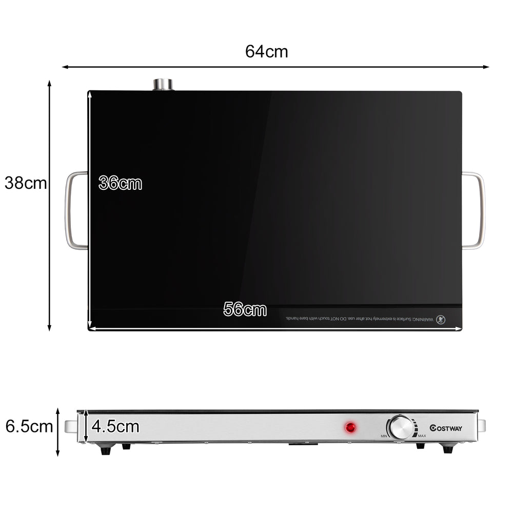 Colour: Silver+ Black Material: Stainless Steel+ Tempered Glass Overall Dimension: 64 cm x 38 cm x 6.5 cm (L x W x H) Warming Surface Size: 56 cm x 36 cm (L x W) Net weight: 3.5 kg Rated Voltage: 230V Rated Frequency: 50-60Hz Rated Power: 300W Package includes: 1 x Warming Tray 1 x Instruction