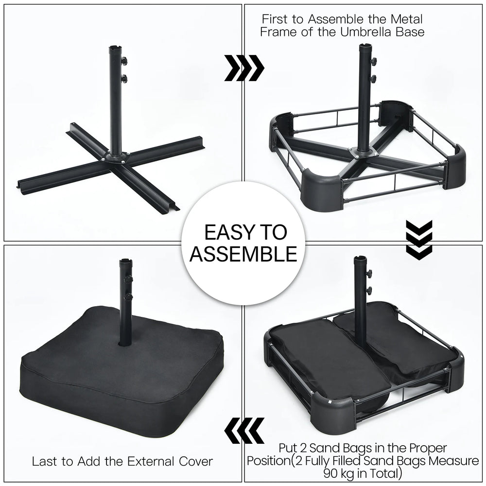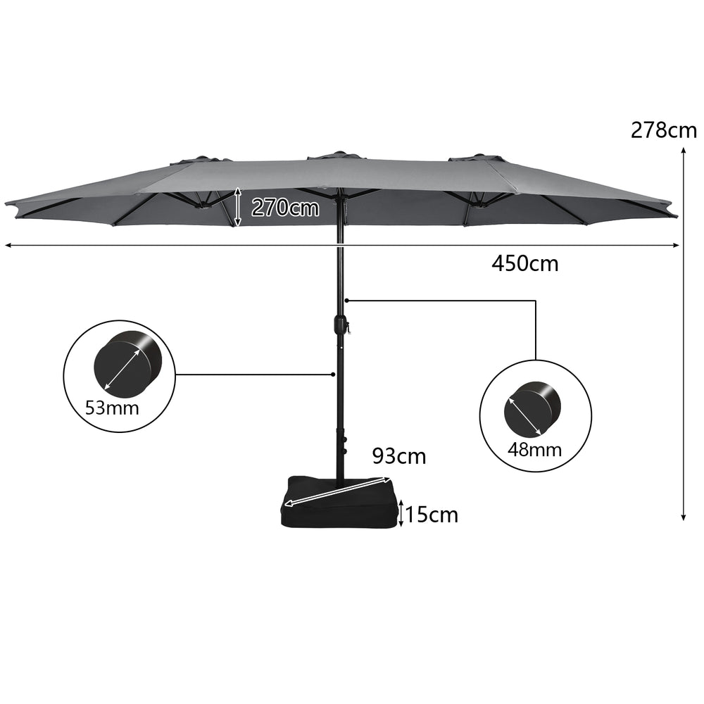 Color: Coffee/Turquoise/Beige/Orange/Wine/Gray Materials: Polyester, iron Product Dimensions: 15 ft x 9 ft x 8ft (L x W x H) Net Weight: 37.5 lbs Package includes: 1x Double-sided umbrella with base stand 1x User's manual