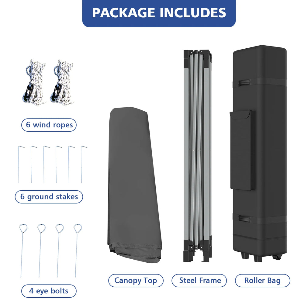 Color: White/blue/gray Material: 300D Oxford cloth + steel Product dimensions: 10' x 20" x 10'-10.5'-11' (L x W x H) Carry bag dimensions: 65"x 15.5"x 9.5" (L x W x H) Net weight: 79.5 lbs Package includes: 1 x Canopy tent 1 x Wheeled storage bag 1 x Instruction 6 x Guy rope 4 x Big stake 6 x Small stake