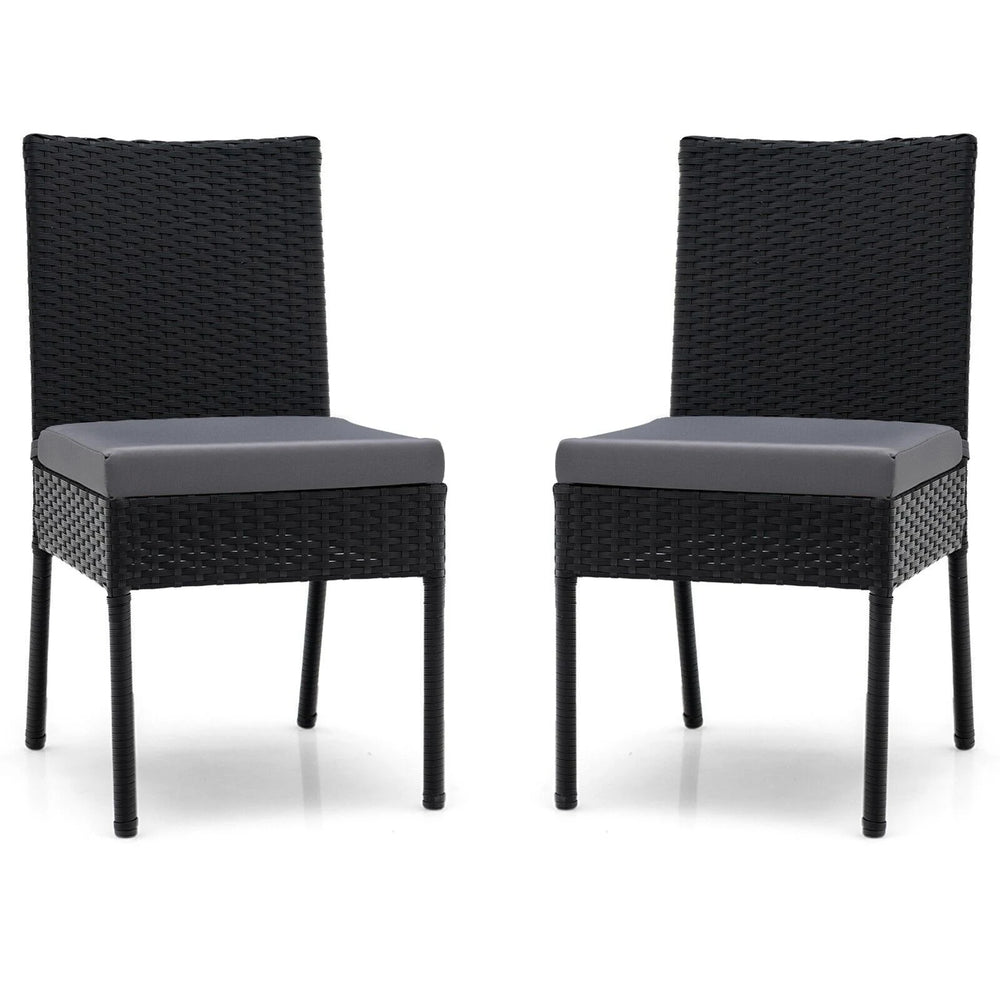 These 2-piece outdoor dining chairs will be the perfect choice for outdoor dining! Made of all-weather PE wicker and rustproof steel frame, these patio chairs will show you their strong stability and high durability in outdoor conditions. When you sit on the chair, the soft padded cushions bring a comfortable sitting experience. And the fixed ropes with hook and loop fasteners keep cushions in place. In addition, to providing coziness, these patio dining chairs match your dining table (not included) perfectly because of the suitable heights. Bullet Point: Soft Padded Cushions: All of these patio chairs feature cozy cushions that not only bring a soft touch but also provide a breathable sitting experience. And the fixed ropes with hook and loop fasteners effectively prevent cushions from moving. The removable covers are easy to clean. Notes of Cushions: Please store cushions in a dry place to obtain a longer lifespan. Due to the light avoidance and light exposure, the colour of the cushions is slightly different. Thanks for your understanding. Selected Black PE Rattan: The high-quality PE wicker, which is weather-resistant, fade-resistant and sun-protective makes these patio dining chairs have a better performance in the outdoor environment. Besides, the PE rattan also endows the modern feeling for these outdoor chairs. Sturdy Construction: Supported by a heavy-duty steel frame with a rustproof surface, these outdoor PE wicker chairs come with a strong loading capacity to support you safely and steadily while ensuring long service time outdoors. Besides, the anti-slip foot pads and reinforced structure add extra stability. Appropriate Height: Measuring 44,5 x 57 x 88 cm (L x W x H) in the dimension (for each chair), these patio chairs match your dining table (not included) perfectly, allowing you to enjoy a delicious meal wherever you want. Please refer to the size description before purchase (there may be small dimensional discrepancies because of the manual measurement). Only 2 Steps to Assemble: The installation of these outdoor dining chairs is labour-saving. There are only 2 steps to screw each chair that can be installed, which greatly saves your precious time and energy. During assembling, we suggest that please do not tighten all the screws until all the holes are aligned. Features: Soft to sit on thanks to the comfortable cushions Avoid cushions being moved with fixed ropes You can remove the cushions through hook and loop fasteners All the covers can be detached for easy cleaning Durable black PE rattan for weather resistance and fade resistance Great for outdoors because of the rustproof steel frame Anti-slip foot pads and reinforced structure for strong stability Fit your dining table (not included) perfectly with the appropriate height Only 2 steps to finish the installation Specifications: Colour of PE Rattan: Black Colour of Cushion: Grey Material: PE Rattan, Steel, Polyester, Cotton Overall Dimension of Each Chair: 44,5 x 57 x 88 cm (L x W x H) Seat Height from the Ground: 42 cm Dimension of Each Cushion: 45 x 43 x 5 cm (L x W x Thickness) Net Weight of Each Chair: 4 kg Weight Capacity of Each Chair: 150 kg Package Includes: 2 x Chairs 2 x Cushions 1 x Instruction