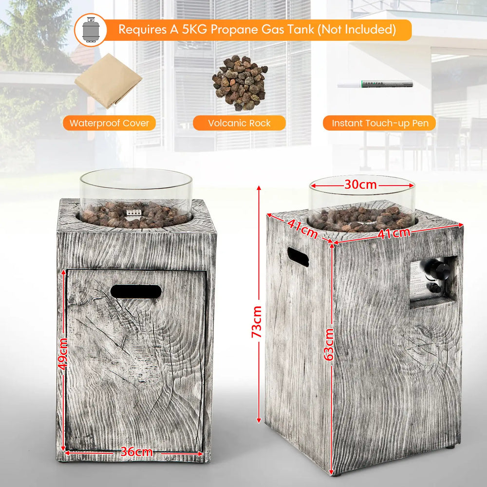 Colour: Grey Material: Ore Powder + Steel + Stainless Steel + PVC + High Borosilicate Glass Overall Dimension: 41 x 41 x 73 cm (L x W x H) Diameter of Wind Guard: 30 cm Net Weight: 23.5 kg Heat Output: 8.79 kW Battery Required: 1 x AAA Battery (Not Included) Package Includes: 1 x Fire Pit Table 1 x Volcanic Rock 1 x PVC Cover 1 x Touch-up Pen 1 x Glass Wind Guard 1 x Instruction Manual