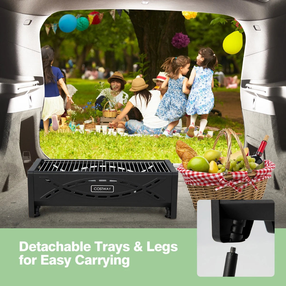 Color: Black Material: Steel, stainless steel Overall dimension: 42.5" x 16" x 29.5"(L x W x H) Dimension of each grill: 9" x 8"(L x W) Size of the side tray: 10.5" x 9.5"(L x W) Weight capacity of each tray: 4.5 lbs Weight capacity of roasting fork: 11 lbs Battery: 1 1.5V D battery(not included) Net weight: 19 lbs Package includes: 1 x Portable charcoal grill 1 x Instruction