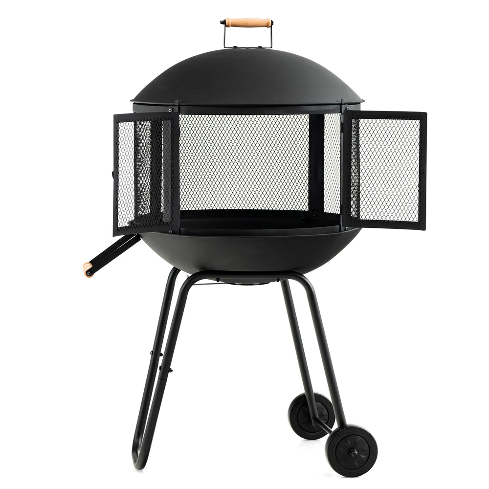 Whether for camping, party, gathering, fire building or any other outdoor activities, this patio fire pit with wheels is always a perfect choice! Made of heavy-duty steel with plastic-sprayed surface, the fire pit is solid, rustproof and heat resistant. And the mesh design effectively promotes air circulation. With this outdoor firepit, you and your friends or family will enjoy an unforgettable outdoor time. Besides, our fire pit is equipped with 2 rolling wheels and a convenient side handle, so you can move the pit anywhere as you like. Apart from that, double doors give you easy access for adding wood and cleaning ashes. The ventilation hole with rotatable base also further helps better maintenance. All in all, this patio fire pit is an awesome addition for outdoor places in winter. Bullet Point: Create More Warmth: With this rolling firepit, you won't feel cold anymore in winter outdoor occasions. Just add logs after opening the 2-door gate and build fire for endless warmness. Apart from that, you can also use charcoal in the firepit for a joyful barbecue. Promote Air Circulation: This outdoor firepit features mesh design and bottom ventilating holes, which effectively promote air ventilation and ensures visibility. Also, the log grate raises the log up for better airflow. And the round fire pit lid spreads heat outward rather than upward. Robust Steel Frame: Constructed of plastic-sprayed steel, the outdoor fire pit is rustproof and heat resistant. Sturdy and durable structure with thick steel mesh and tubes also ensures the long-lasting service life. Besides, each part of the fire pit is connected with premium metal hardware for higher stability. User-Friendly Design: Equipped with 2 smooth wheels and a wood handle on the side, the firepit is simple to move anywhere you want. Both the top handle and side handle are made of solid pine wood, which protect you from scorching heat. Furthermore, the bottom ventilation holes are designed with a rotatable base for convenient open and close. Simple Assembly & Maintenance: The firepit comes with a functional fire poker for safe operation. The assembly is also effortless with complete hardware and the clear instruction. Plus, the 2-door gate allows you to clean the inside space more thoroughly. Features: Can be used for heating or barbecue Wire mesh and ventilating holes for better air circulation Log grate elevates the burning logs for better airflow Round firepit ensures better heat dissipation Plastic-sprayed steel frame for rust and heat resistance Bottom wheels and side handle make movement quite effortless Solid pine wood handle is cool to touch Rotatable base makes it easy to seal the ventilation holes Easy to assemble and clean Specifications: Color: Black Material: Steel, Pine Wood Overall Dimension:69 x 51 x 108 cm (L x W x H) Net Weight:9 kg Weight Capacity:40 kg Package Includes: 1 x Outdoor Fire Pit 1 x Fire Poker 1 x Instruction
