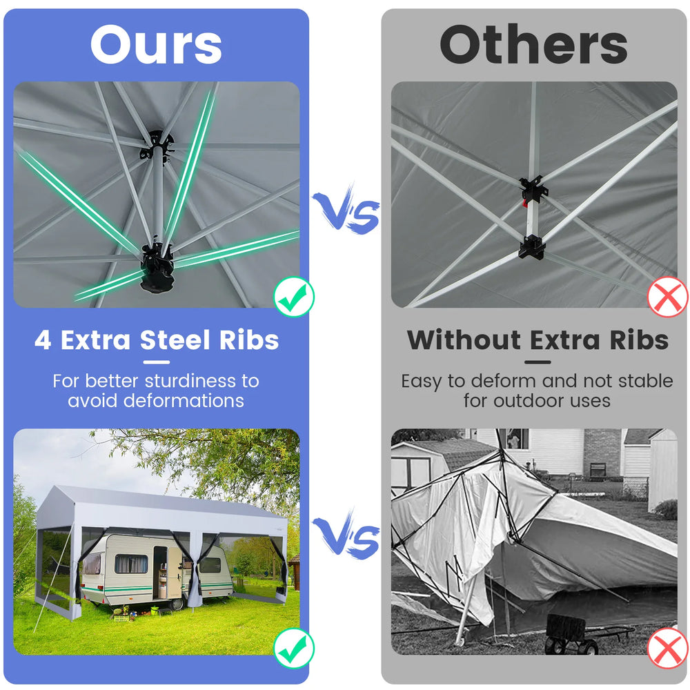 Color White + Black Material Steel, 150D Silver-Coated Oxford, 600D PVC, PU Overall Dimension 10ft x 20ft x 9.5/8.3/7ft (L x W x H) Size of Wheeled Bag 4.2ft x 1.2ft x 0.8ft (L x W x H) Suitable Number of People 16-24 Net Weight 85lbs