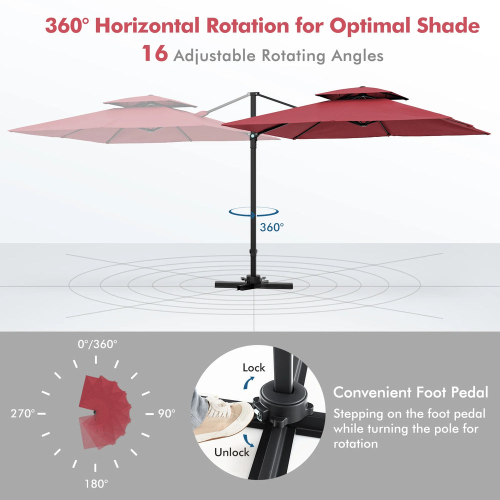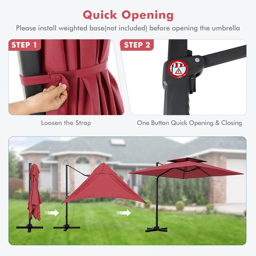 The patio cantilever umbrella features a foot pedal with 16 gears, which is upgraded to provide 16 rotational directions for protection from the sun throughout the day. Equipped with a premium polyester fabric, it features excellent wear-resistant for lasting use. Meanwhile, it will effectively protect you from harsh sunlight and light rain. Additionally, double vented top is designed to avoid stuffy experience and improve wind-resistance. Besides, the main pole is constructed of powder-coated aluminum to resist rust and enhance stability. And there are 8 metal ribs to improve sturdiness. For your convenience, the patio umbrella is quick to open by simple pulling. When not in use, it could be easily stored by fixing the canopy with strap. Hence, it is a good choice to enjoy sun shade in your backyard, pool, garden. And here is a warm tip: Apart from included cross base, a weighted base(not included) is essential to stabilize the patio offset umbrella. Enjoy Shade in Desired Directions: Designed with a convenient foot pedal, the square patio umbrella is 360rotatable by simply stepping on the pedal and turning the pole. Besides, the patio umbrella features 16 adjustable rotating angles , enabling you to get sun protection at any time of the day. Stable Heavy Duty Frame: The patio offset umbrella is supported by stable aluminum main pole and 8 metal umbrella ribs, which are sprayed to resist rust for lasting outdoor use. Additionally, the triangular structure at the top makes the umbrella more windproof. Premium Dual Vented Canopy: Made of 220g polyester fabric, our patio cantilever umbrella is wear-resistant, drizzle-proof and UV-resistant, which is dedicated to providing you with longer protection in outdoors. Moreover, there is a dual vented top to provide cool experience and keep the umbrella stable in windy days. Easy to Setup and Operate: With detailed installation instruction, the assembly of our outdoor cantilever umbrella will not be a hassle for you. And the opening is a breeze, you just need to loosen the strap and manually push the pole upward while pulling the umbrella outward. Extra Weighted Base is Needed:The outdoor patio umbrella comes with a metal cross base for added stability. To prevent the patio umbrella from tipping over, please install weighted base(not included) before opening the umbrella. Then you can enjoy outdoor scenery in patio, garden, backyard.