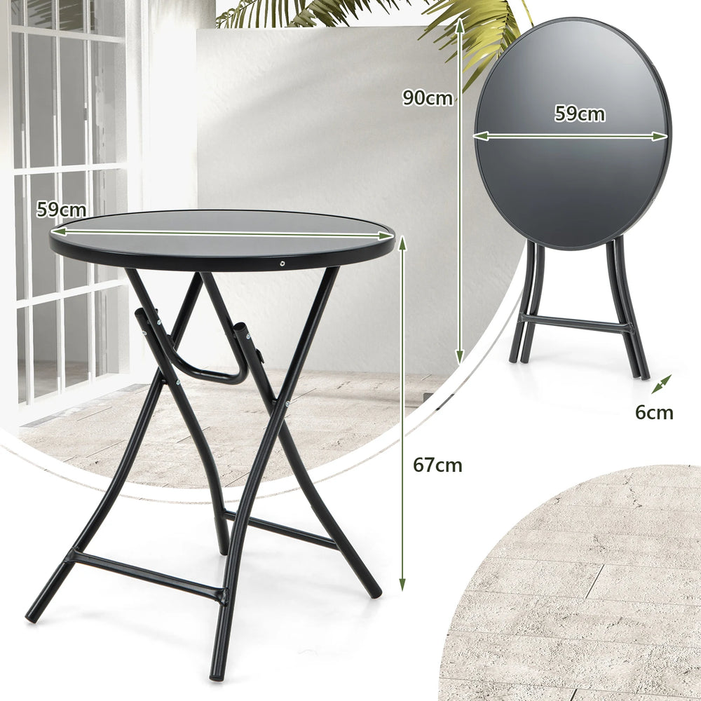 Color: Black Material: Metal, Tempered Glass Size: 23" x 26.5" (Dia x H) Folding Dimension: 35.5" x 23" x 2.5"(L x W x Thickness) Net Weight: 13.5 lbs Weight Capacity: 110 lbs Package Includes: 1 x Folding Table 1 x Instruction