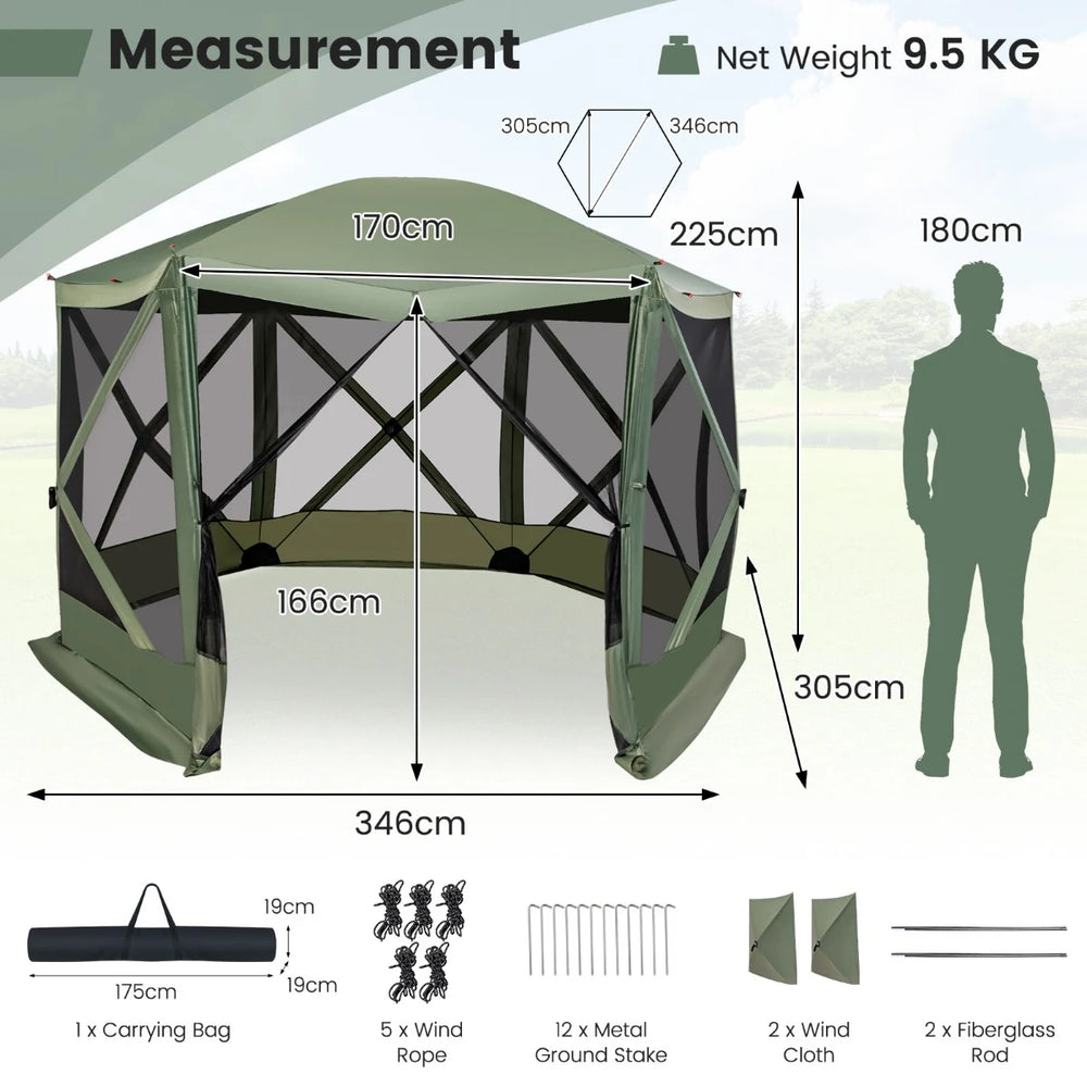 Color Coffee/Green Material 210D Oxford Fabric, Mesh, Fiberglass Rod Overall Dimensions 11.5 x 11.5 x 7.5 ft (L x W x H) Size of the Mesh Sidewall 5.6 X 5.7 ft (L x W) Size of the Carrying Bag 5.8 x 0.6 x 0.6 ft (L x W x H) Net Weight 9.5 kg