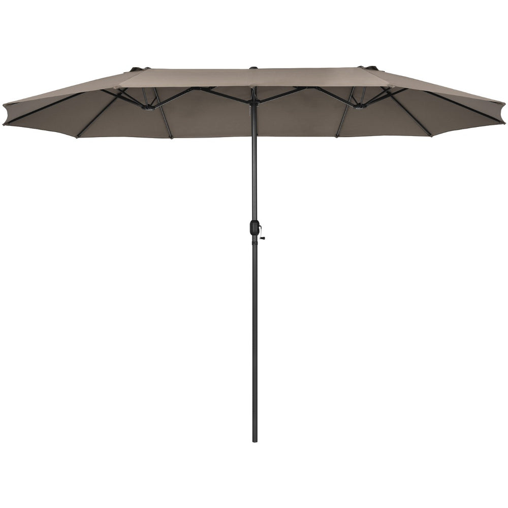 Are you looking for a patio umbrella that will provide you with a shady and comfortable relaxation place? The double-sided patio umbrella is an ideal choice. Crafted with 12 sturdy ribs and thick metal pole, the twin outdoor umbrella showcases firmness and durability. In addition, the market umbrella with double-sided canopy blocks up extra sunlight and creates large shady space. Equipped with convenient hand crank, you can open and close the umbrella smoothly. If the umbrella is not in use, do not forget to tie the fixation strap for longer using life. Following the detailed instruction, you can assemble the umbrella in a few minutes. What's more, the market umbrella perfectly matches with different places, bringing cozy and shady space. (Note: A weighted base (sold separately) is needed for better stability) Bullet Point: Double-Sided Canopy with Large Shade: The twin patio umbrella provides you and a set of outdoor furniture with sufficient coverage space, bringing shady feel to sultry afternoon. Besides, there are three air-vented holes on the top to promote the circulation for breeze creation. Hand-Crank Mechanism for Smooth Opening: Comes with a convenient hand-crank system, you can open and close the umbrella smoothly and effortlessly. You can adjust the umbrella by rotating the mechanism. In order to prolong the using time, please close the umbrella with the fixation strap when it is not in use. 12-Rib Metal Frame and Sun-Protective Canopy: This patio umbrella is crafted with 12 enhanced steel ribs, showcasing excellent sturdiness and lasting durability. In addition, covered by polyester fabric, this outdoor umbrella is fadeless and premium to block up extra sunlight. Wide Application in Various Occasions: This twin umbrella with effective sun protection is suitable for different decoration styles outdoors, such as patio, garden and backyard. Also, this umbrella can also meet commercial needs, creating shady space to outdoor market, cafe and bars. Simple Installation for Quick Use: You will receive one package with all parts and detailed instruction for assembly, which allows you to finish the installation in a few minutes. Please note that the weighted base of the umbrella is not included in this offer (sold separately). Feel free to chat us if you have any problem. Features: Double-sided canopy offers large shading coverage Premium polyester canopy fabric for sun protection Sturdy metal frame ensures long-term outdoor use Hand-crank system for convenient closing and opening Top vents are designed for breeze creation and air circulation A charming decoration for patio, garden and outdoor café Easy assembly and maintenance save time and energy A weighted base (sold separately) is needed for better stability