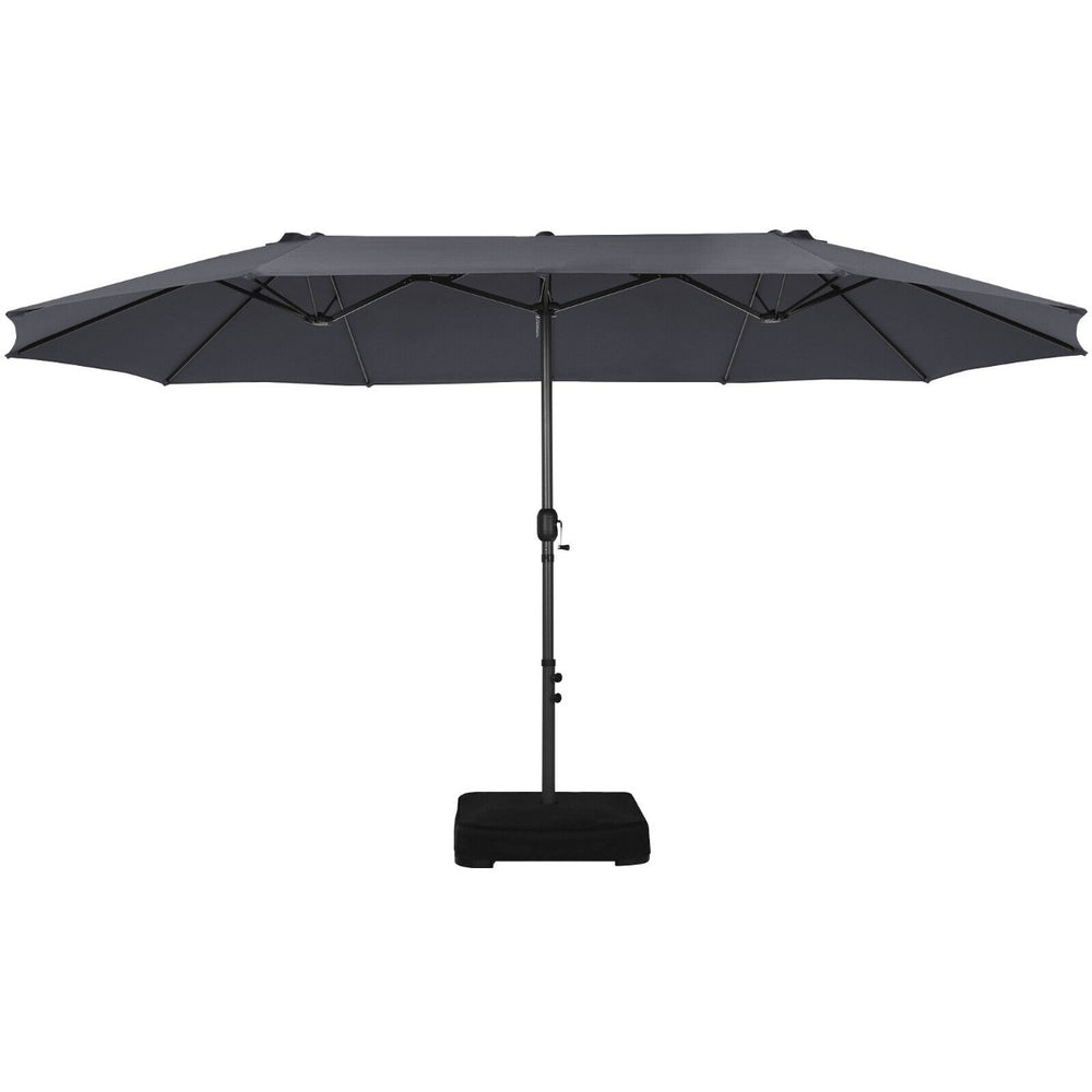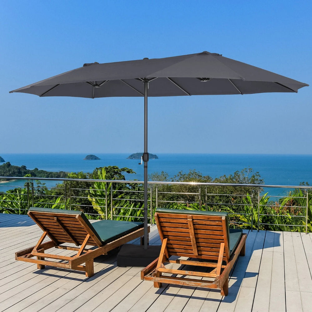 The 450cm double-sided patio umbrella will provide you with an oversized shade area for outdoor activities in hot weather. It can accommodate large dining tables, chairs and multiple people, making it ideal for outdoor gatherings on decks, poolsides, courtyards and more. In addition, the umbrella pole has an easy-to-operate manual crank, allowing you to easily open and close it within seconds. To extend the service life of our umbrella, we use a high-quality polyester fabric, which is not only waterproof and rust-proof but also breathable. In addition, the roof is ventilated to improve air circulation and stability. Whats more, we provide a metal base and two sandbags for filling the base to further enhance the windproof performance of the umbrella when it is used outdoors. The entire umbrella is made of a powder-coated metal frame, which ensures a long period of time. If you are looking for a product like this, do not hesitate to place an order! Double-Sided Shading Space: This 450cm rectangular double-sided umbrella provides a larger shade area than many outdoor umbrellas on the market. The beach parasol can accommodate large tables and chairs, perfect for dinner or parties, which is ideal for terraces, gardens, balconies, decks, courtyards and pools. Easy to Operate Crank Handle: There is a metal hand-cranked mechanism on the umbrella pole that allows you to easily open and close the extra large umbrella by rotating it in seconds, making it easy to store at home when not in use. In addition, an aluminium alloy crank is not easy to rust and can be used for a long time. Equipped with Matching Base: This sunshade umbrella comes with a stand that matches the size of the pole, so you don't have to spend extra time and energy picking out a suitable base. And the stand consists of a cross metal base and two sandbags, which can be filled with sand to improve the stability of the two-sided umbrella. Premium Fabric and Vented Top: The double-sided market parasol is made of 180g polyester fabric, which is waterproof, breathable, fade resistant, and has a long service life. In addition, the top of the tent is ventilated to promote air circulation and keep the umbrella cool. Super Sturdy Metal Frame: This double patio sunshade shelter is made of iron and coated with powder to prevent rust and corrosion. And the 12 sturdy umbrella ribs provide perfect support for the canopy, so our umbrella stays stable in windy weather.