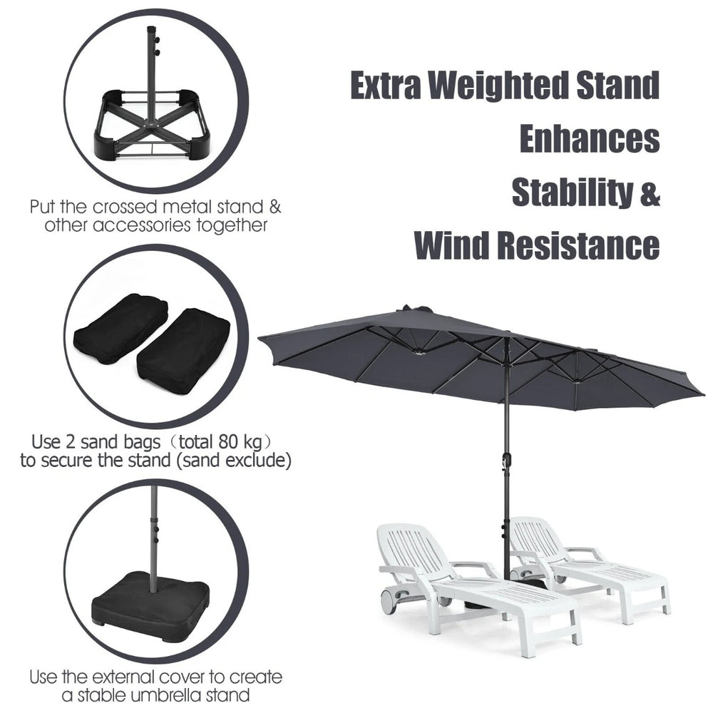 Colour: Dark Grey Material: Iron + polyester fabric + aluminium alloy Overall dimension: 450 cm x 270 cm x247cm(L x W x H) Umbrella stand dimension: 72 cm 72 cm 15 cm (L W H) Net weight: 17 kg Package includes: 1 x Double-sided umbrella 1 x Umbrella stand 1 x Instruction manual