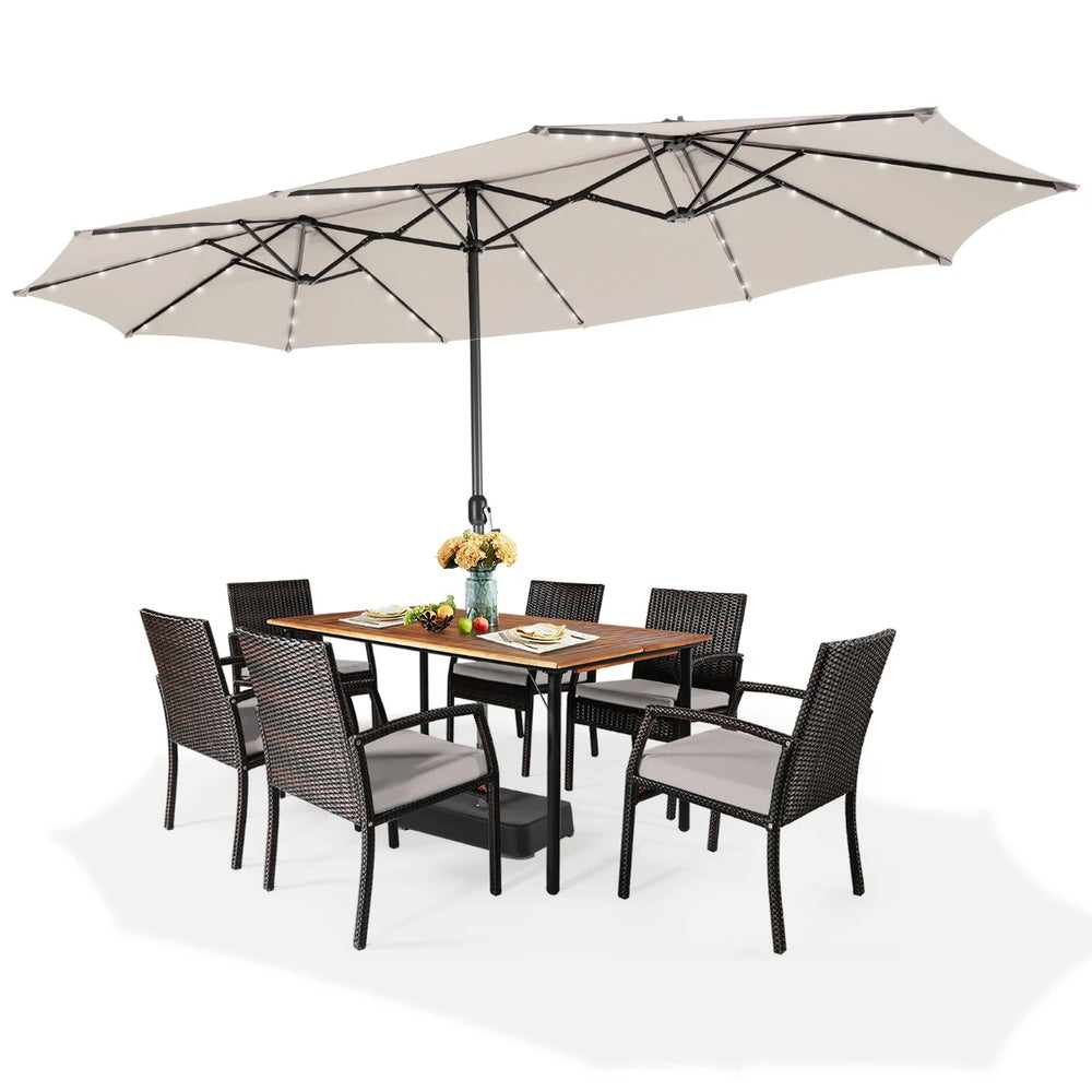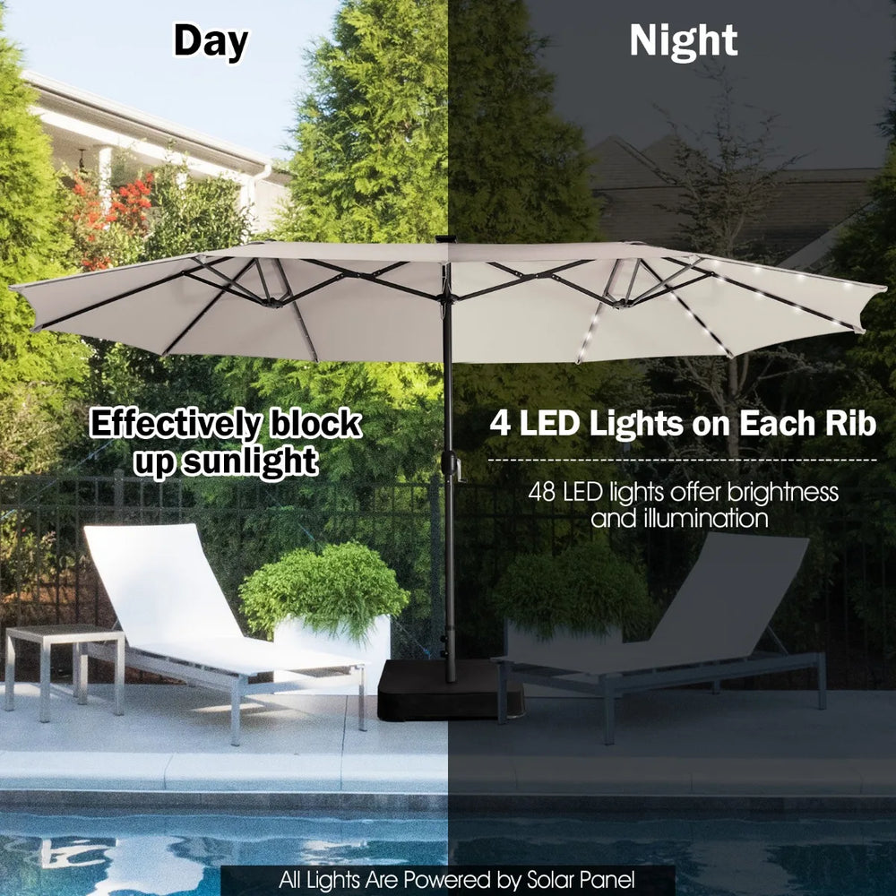 This twin outdoor umbrella offers comfortable shading place for garden, backyard, patio and market. If you have needs to block up the sunlight, this double-sided umbrella will be your ideal choice. Comes with 450cm x 270cm large canopy, this patio umbrella will provide roomy shading space for you to enjoy the coolness. Since the durable polyester fabric, the umbrella will effectively block up the sunlight, and the fabric is fade resistant for long-term outdoor use. Whats more, there are 48 solar LED lights on the ribs to offer brightness and enhance romantic feel during night talk. The hand crank mechanism facilitates umbrella opening and closing, and the widen base with weighted sand bag (sands are not included) increases using stability. With all parts given in the package, the umbrella installation is quick to finish by following the detailed instruction. Ultra-Large Shady Space: This twin patio umbrella, 450cm x 270cm, provides spacious shading area for a set of outdoor furniture to create comfortable relaxation place. Featured with heavy-duty steel, this umbrella with 12-rib structure ensures excellent sturdiness and lasting durability. Solar Lights for Enjoyable Experience: Comes with 48 LED lights on the ribs, this patio umbrella is also ideal for night use. All lights are powered by a solar panel on the canopy top, convenient and energy-saving. The light switch is on the rib for easy control, and you can enjoy night talk with friends and family under the romantic light. Convenient Hand-Crank Mechanism: Thanks to the user-friendly crank mechanism, this patio umbrella is easy to open and close by rotating the handle, blocking up sunlight from all directions. When it is totally closed, you can fasten the umbrella with the long strap for better storage. Vented Canopy with Durable Fabric: There are ventilation holes on the top, enhancing air circulation and reducing wind pressure. In addition, the premium polyester fabric canopy is fade-resistant for long-term outdoor use, and also good for blocking up extra sunlight. Easy-to-Assemble Widened Base: The extra base comes with 2 large sandbags (sands are not included, and each sand bag can be filled with 30 kg sand to keep the umbrella stable), preventing wobbling during use. Besides, it is ultra-quick to assemble the base and umbrella by following the detailed instructions.