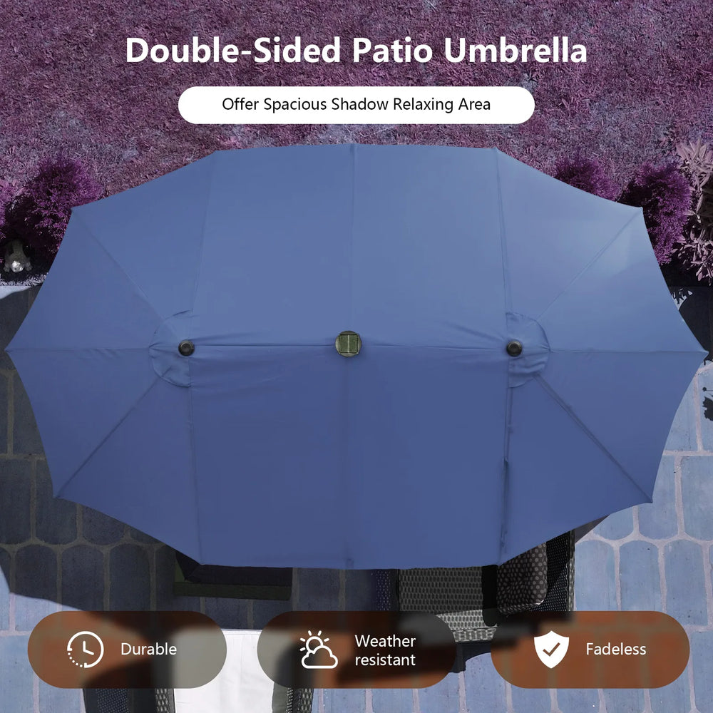 This twin outdoor umbrella offers comfortable shading place for garden, backyard, patio and market. If you have needs to block up the sunlight, this double-sided umbrella will be your ideal choice. Comes with 450cm x 270cm large canopy, this patio umbrella will provide roomy shading space for you to enjoy the coolness. Since the durable polyester fabric, the umbrella will effectively block up the sunlight, and the fabric is fade resistant for long-term outdoor use. Whats more, there are 48 solar LED lights on the ribs to offer brightness and enhance romantic feel during night talk. The hand crank mechanism facilitates umbrella opening and closing, and the widen base with weighted sand bag (sands are not included) increases using stability. With all parts given in the package, the umbrella installation is quick to finish by following the detailed instruction. Ultra-Large Shady Space: This twin patio umbrella, 450cm x 270cm, provides spacious shading area for a set of outdoor furniture to create comfortable relaxation place. Featured with heavy-duty steel, this umbrella with 12-rib structure ensures excellent sturdiness and lasting durability. Solar Lights for Enjoyable Experience: Comes with 48 LED lights on the ribs, this patio umbrella is also ideal for night use. All lights are powered by a solar panel on the canopy top, convenient and energy-saving. The light switch is on the rib for easy control, and you can enjoy night talk with friends and family under the romantic light. Convenient Hand-Crank Mechanism: Thanks to the user-friendly crank mechanism, this patio umbrella is easy to open and close by rotating the handle, blocking up sunlight from all directions. When it is totally closed, you can fasten the umbrella with the long strap for better storage. Vented Canopy with Durable Fabric: There are ventilation holes on the top, enhancing air circulation and reducing wind pressure. In addition, the premium polyester fabric canopy is fade-resistant for long-term outdoor use, and also good for blocking up extra sunlight. Easy-to-Assemble Widened Base: The extra base comes with 2 large sandbags (sands are not included, and each sand bag can be filled with 30 kg sand to keep the umbrella stable), preventing wobbling during use. Besides, it is ultra-quick to assemble the base and umbrella by following the detailed instructions.