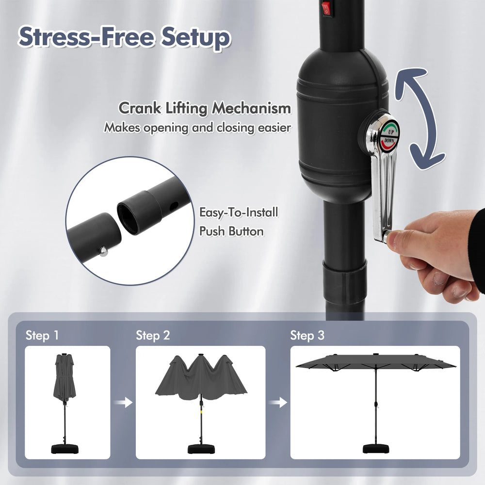 13FT Double-sided Patio Umbrella with Solar Lights for Garden Pool Backyard-Gray