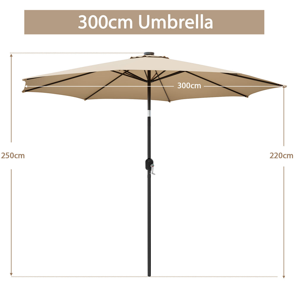 Specifications: Colour: Beige Material: Metal, 180 G Polyester, Aluminum Alloy Overall Dimension: 300 cm x 300 cm x 251 cm (L x W x H) Umbrella Rim Height: 220 cm Net Weight: 6.5 kg Package Includes: 1 x Patio Umbrella 1 x User's Manual