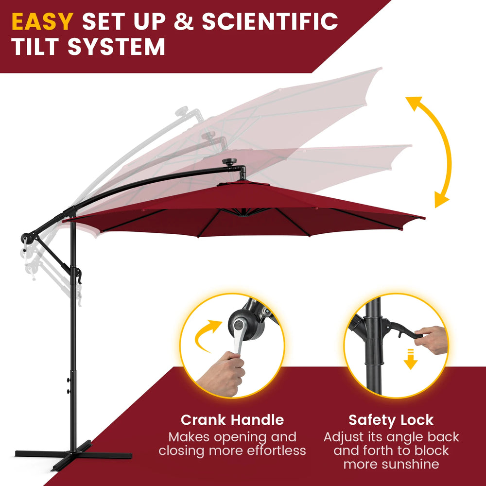 Bring practical, illuminated shade to your garden, patio or poolside with this solar-powered 303cm offset umbrella. The large 303cm canopy gives generous coverage while the raised 243.5cm height keeps furniture and sightlines clear, and the top air vent helps with heat dissipation and wind flow.