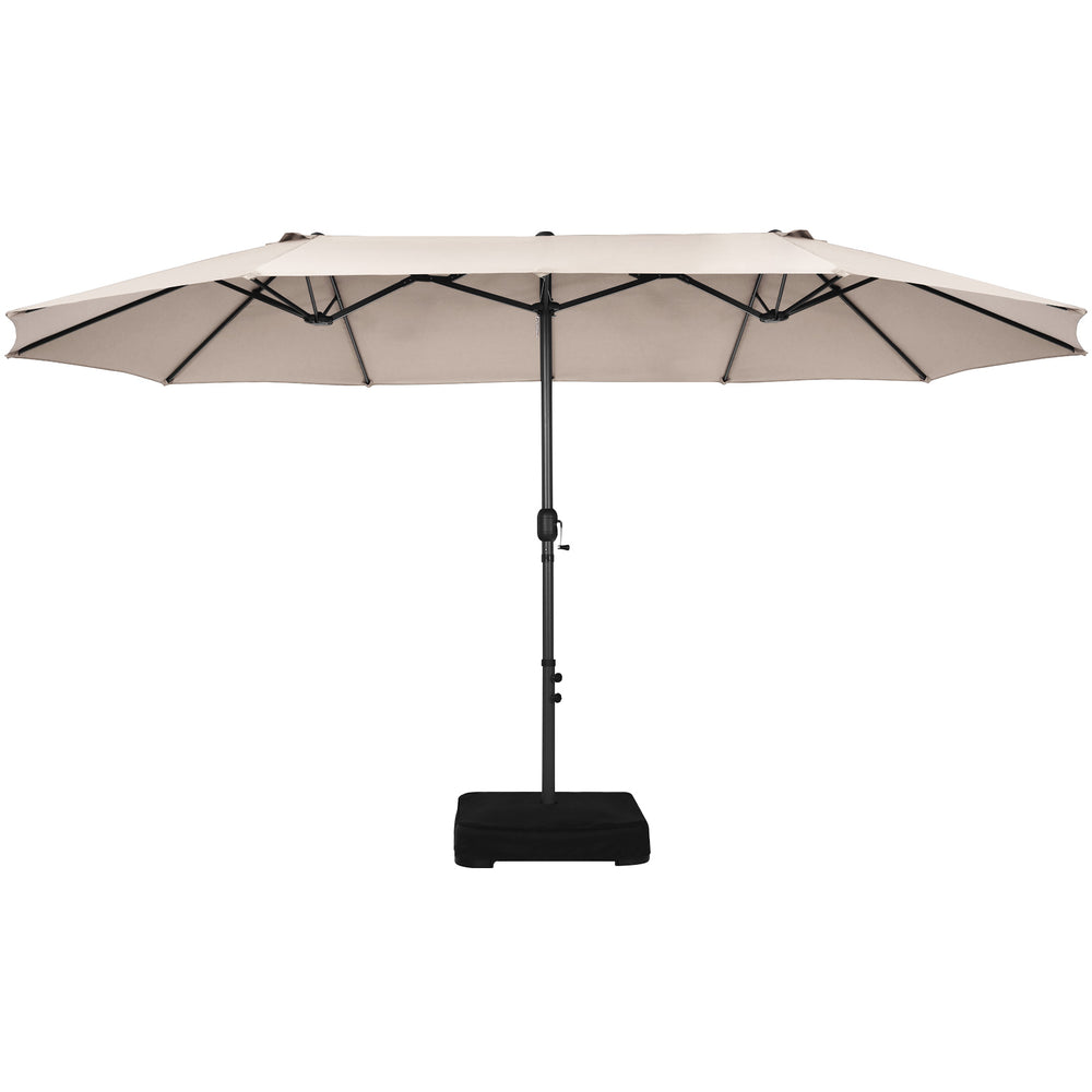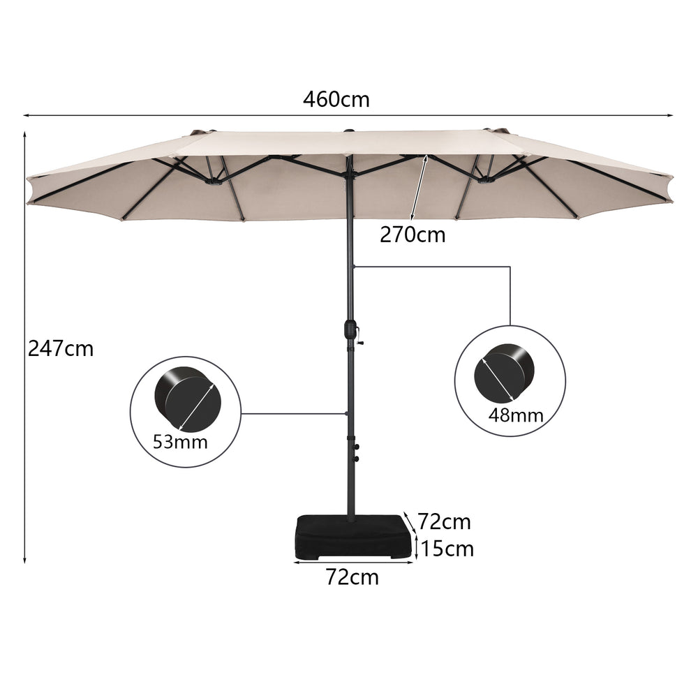 Colour: Beige Material: Steel + Polyester Fabric + Aluminum Alloy Overall Dimension: 460 cm x 270 cm x 247 cm (L x H) Umbrella Stand Dimension: 72 cm × 72 cm × 15 cm (L × W × H) Net Weight: 17 kg Box QTY: 1(May vary by batch) Package includes: 1 x Double-sided Umbrella 1 x umbrella Stand 1 x Instruction Manual