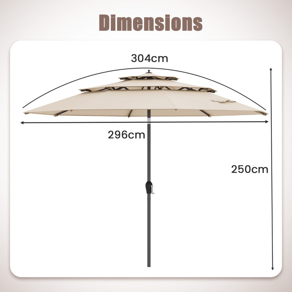 296cm 3 Tier Outdoor Umbrella With Double Vented for Market Backyard Pool Garden-Brown