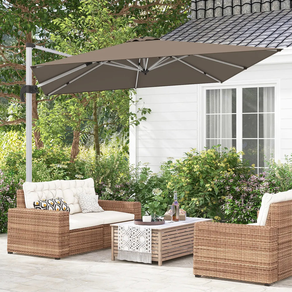 Indulge in Luxurious Shade and Modern Design for the Ultimate Outdoor Retreat!Our outdoor patio umbrella measures 300 x 300 x 261 cm (L x W x H), providing an expansive shade area for various outdoor activities, whether it's a bustling commercial area or a cozy backyard retreat. With the ability to rotate a full 360 effortlessly and adjust the tilt angles in 5 positions, you can enjoy the optimal shade throughout the day. Other than that, the canopy is crafted from 100% new yarn-dyed polyester fabric, which is UPF50+ sun-protective and 3-year fade-resistant, ensuring long-term outdoor use. To enhance its wind resistance, the offset umbrella boasts a thick aluminum pole and 8 heavy-duty ribs, providing reliable support in windy conditions. And thanks to the convenient crank handle, you can effortlessly open or close your umbrella.Note: We recommend a weighted base (not included) to fix the umbrella for enhancing wind resistance. Luxurious Shade Retreat: The canopy of this outdoor patio umbrella measures 10 x 10 ft/300 x 300 cm (L x W), providing a large shading area for various commercial and residential settings, such as poolsides, yards, gardens, coffee shops, and more. It includes a robust crossed base, and we recommended a weighted base (not included) to fix the umbrella for enhancing wind resistance. 360 Rotation and Tilt Adjustment: The cantilever umbrella can be freely rotated 360 by stepping on the foot pedal and rotating the umbrella pole. Moreover, there are 5 adjustable tilt angles, which can be simply adjusted by moving the crank handle up and down. Thus, this umbrella could offer protection and shade throughout the day. Premium 250 GSM Yarn-Dyed Polyester Fabric: This offset umbrella canopy is crafted of high-quality yarn-dyed polyester fabric, ensuring superior UPF50+ sun protection and water resistance. More than that, this fabric is designed to resist color fading for up to 3 years, maintaining its vibrant appearance. Robust and Stable Construction: The heavy-duty patio umbrella is constructed of a thick umbrella pole and 8 heavy-duty ribs that provide exceptional support, which is built to withstand the elements. And the top reinforced triangular structure helps stabilize the umbrella during windy conditions. Effortless Operation: This square cantilever umbrella adopts a hassle-free crank handle, making it easy to open and close the umbrella by rotating it. And there is a convenient loop strap to secure the umbrella into a compact size when not in use. Note: We recommend folding and covering it to prolong its lifespan in nighttime or under extreme weather conditions. Double-Top Design: The large outdoor sun umbrella features wind vent design on the top, which could promote air circulation for a more comfortable outdoor experience, while enhancing stability in windy conditions.