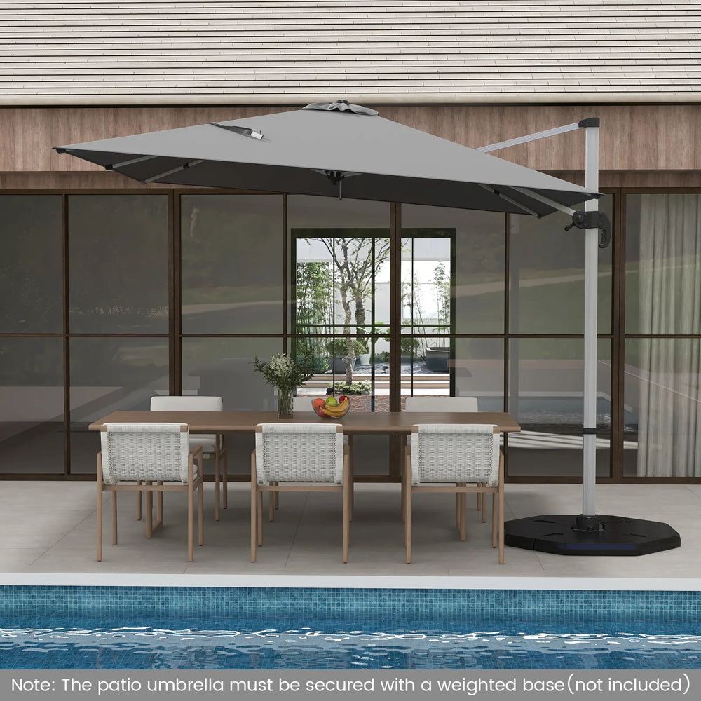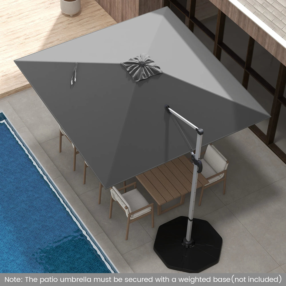 Indulge in Luxurious Shade and Modern Design for the Ultimate Outdoor Retreat!The outdoor patio umbrella measures 300 x 300 x 261 cm (L x W x H), providing an expansive shade area for various outdoor activities, whether it's a bustling commercial area or a cozy backyard retreat. With the ability to rotate a full 360 effortlessly and adjust the tilt angles in 5 positions, you can enjoy the optimal shade throughout the day. Other than that, the canopy is crafted from 100% new yarn-dyed polyester fabric, which is UPF50+ sun-protective and 3-year fade-resistant, ensuring long-term outdoor use. To enhance its wind resistance, the offset umbrella boasts a thick aluminum pole and 8 heavy-duty ribs, providing reliable support in windy conditions. And thanks to the convenient crank handle, you can effortlessly open or close your umbrella.Note: We recommend a weighted base (not included) to fix the umbrella for enhancing wind resistance. Luxurious Shade Retreat: The canopy of this outdoor patio umbrella measures 10 x 10 ft/300 x 300 cm (L x W), providing a large shading area for various commercial and residential settings, such as poolsides, yards, gardens, coffee shops, and more. It includes a robust crossed base, and we recommended a weighted base (not included) to fix the umbrella for enhancing wind resistance. 360 Rotation and Tilt Adjustment: The cantilever umbrella can be freely rotated 360 by stepping on the foot pedal and rotating the umbrella pole. Moreover, there are 5 adjustable tilt angles, which can be simply adjusted by moving the crank handle up and down. Thus, this umbrella could offer protection and shade throughout the day. Premium 250 GSM Yarn-Dyed Polyester Fabric: This offset umbrella canopy is crafted of high-quality yarn-dyed polyester fabric, ensuring superior UPF50+ sun protection and water resistance. More than that, this fabric is designed to resist color fading for up to 3 years, maintaining its vibrant appearance. Robust and Stable Construction: The heavy-duty patio umbrella is constructed of a thick umbrella pole and 8 heavy-duty ribs that provide exceptional support, which is built to withstand the elements. And the top reinforced triangular structure helps stabilize the umbrella during windy conditions. Effortless Operation: This square cantilever umbrella adopts a hassle-free crank handle, making it easy to open and close the umbrella by rotating it. And there is a convenient loop strap to secure the umbrella into a compact size when not in use. Note: We recommend folding and covering it to prolong its lifespan in nighttime or under extreme weather conditions. Double-Top Design: The large outdoor sun umbrella features wind vent design on the top, which could promote air circulation for a more comfortable outdoor experience, while enhancing stability in windy conditions.